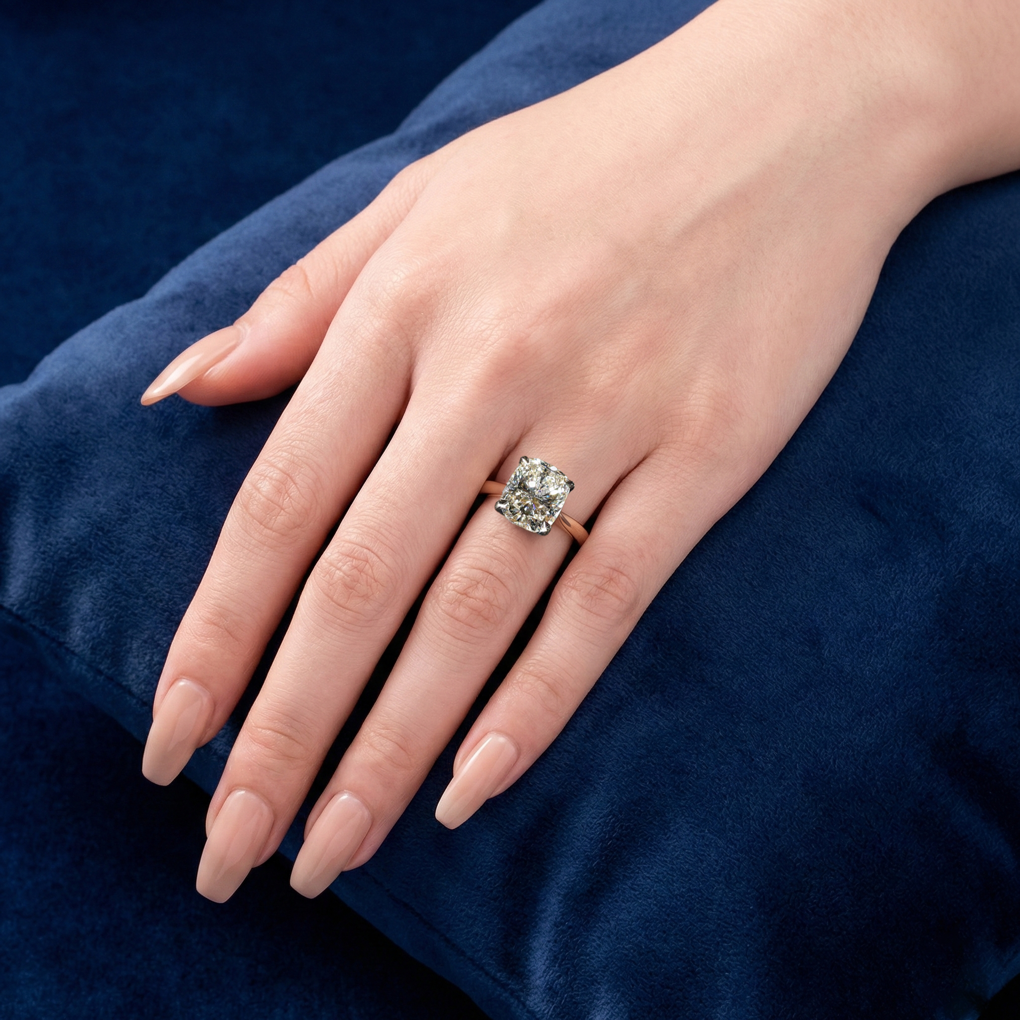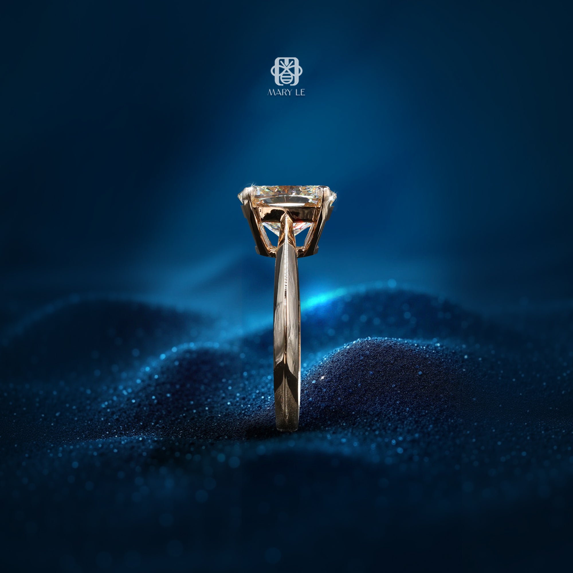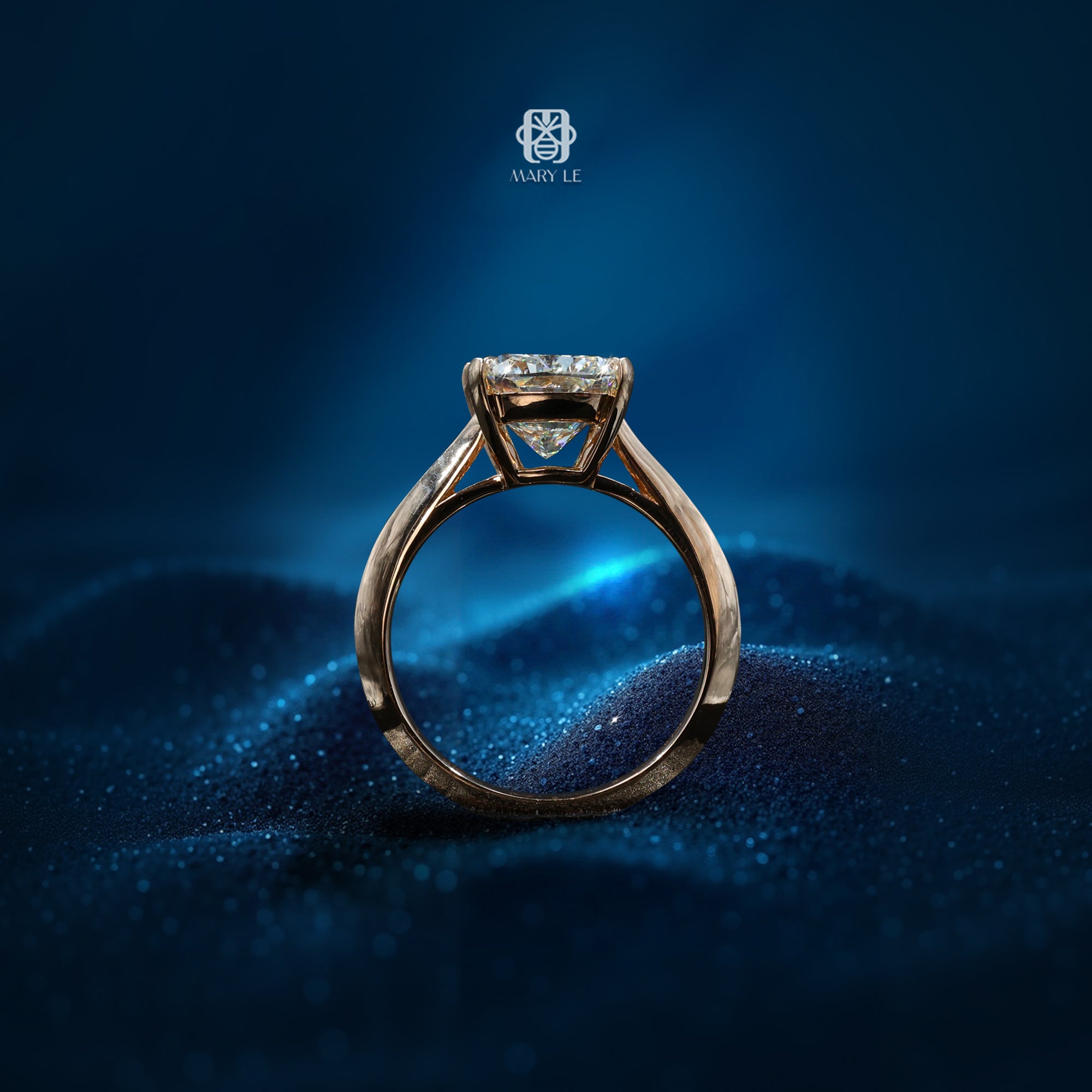 Tựa ô cửa sổ nhỏ của biệt thự cổ, viên kim cương chủ Cushion 3.02 carat mở ra cảm giác của một khung ánh sáng xưa cũ, mọi tia nắng đều được chắt lọc, tinh khiết và trong trẻo trước khi tràn vào không gian. Độ bo tròn mềm mại của dáng Cushion gợi đường viền của những cửa sổ châu Âu xưa: không vuông tuyệt đối, không tròn tuyệt đối, mà là sự hòa hợp duyên dáng giữa góc cạnh và mềm mại. Cảm giác như đang ngắm ánh sáng xuyên qua lớp kính pha lê cổ, thứ ánh sáng đã được ấp ủ qua thời gian để trở nên sâu, ấm và có chiều dày cảm xúc. 18K vàng hồng, bậu cửa bằng gỗ sồi được sơn phủ thời gian ấm áp, sang trọng, nâng giữ “khung cửa sổ” bằng thứ sắc độ cổ điển.