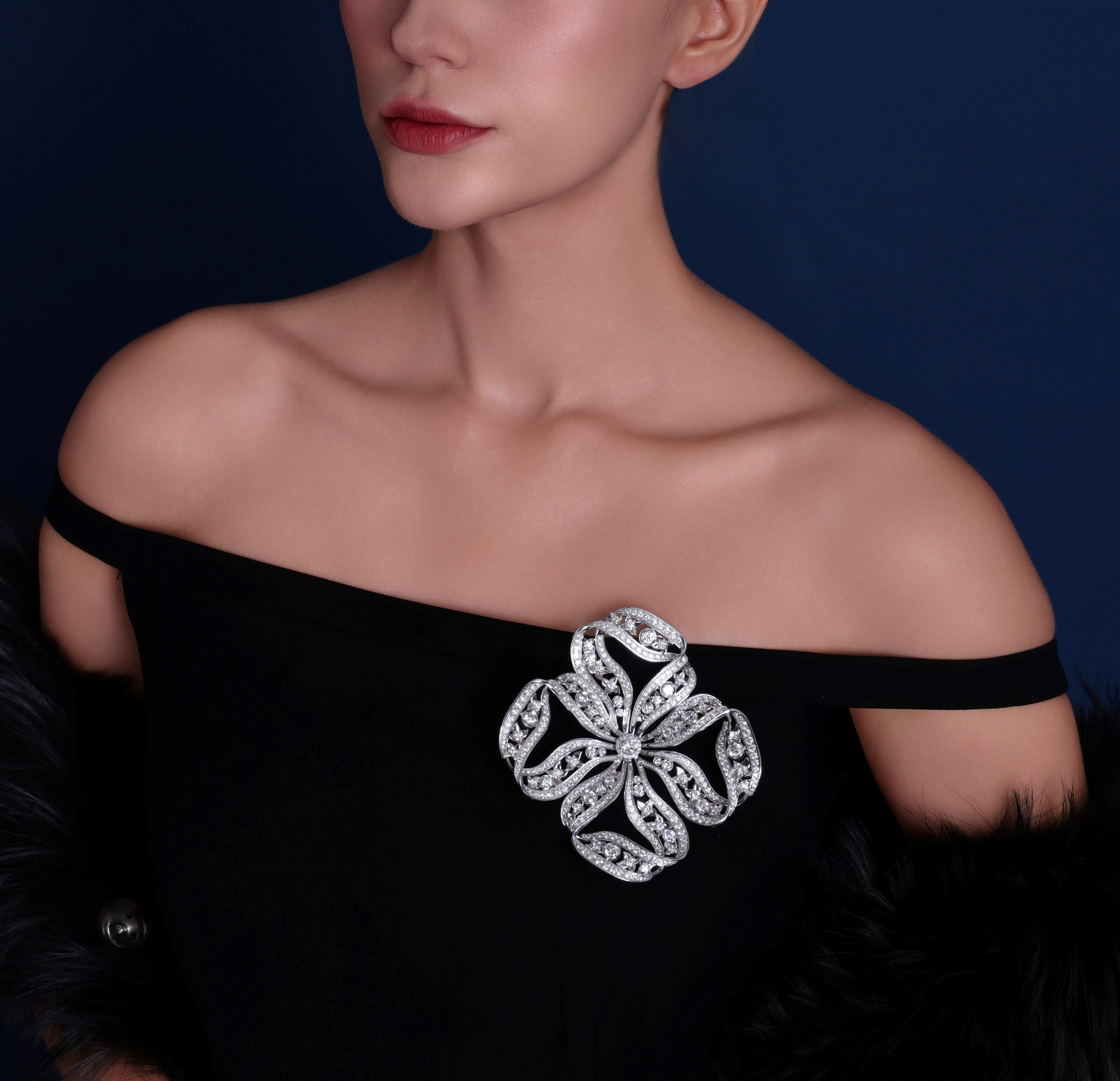 A masterpiece from the "Velvet Flow" collection, this bow is likened to a stream of silk light flowing gracefully through space - where soft, feminine beauty meets the sophistication of jewelry techniques. The focal point of the design is a 1.30ct colorless round diamond, shining brightly like a beating heart in an elegant movement. The main stone is like the focal point of all eyes, where light begins to spread to each bow petal. The bow petals are shaped like gently twisted silk strips, artistically curved.