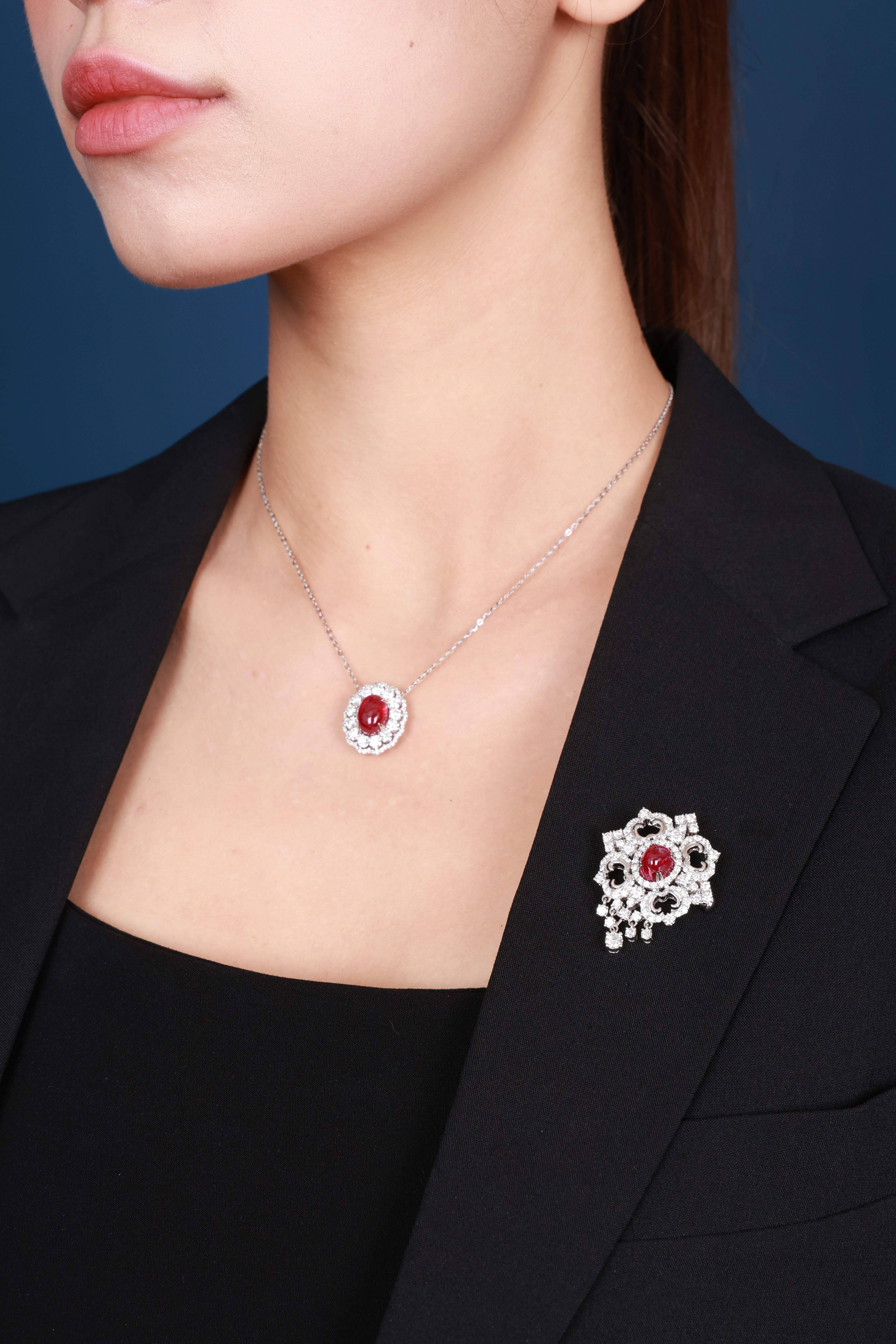 The Ruby diamond necklace is the perfect combination of fiery passion and eternal beauty. The centerpiece is the pendant with an oval ruby, with a mysterious red color - a symbol of passion and luck. The vitality of the Ruby is enhanced by the surrounding border of 103 sparkling diamonds, ranging in diameter from 1mm to 3mm, meticulously selected and set in 18K white gold.