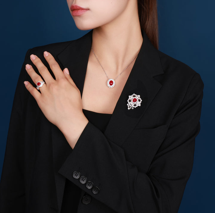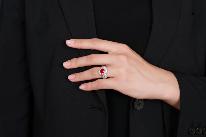 The entire design is completed on a high-quality 18K white gold background, creating a subtle combination of brilliant red and pure white light. The ring is suitable for a woman who is confident and charming but always maintains a gentle and elegant style.