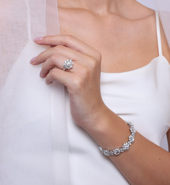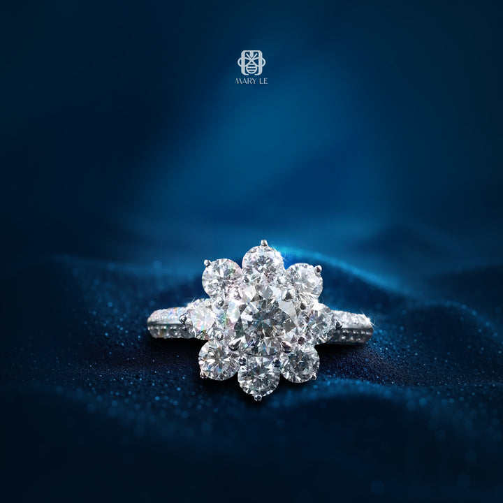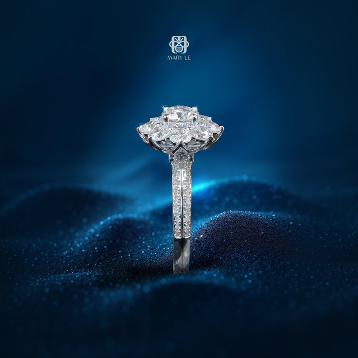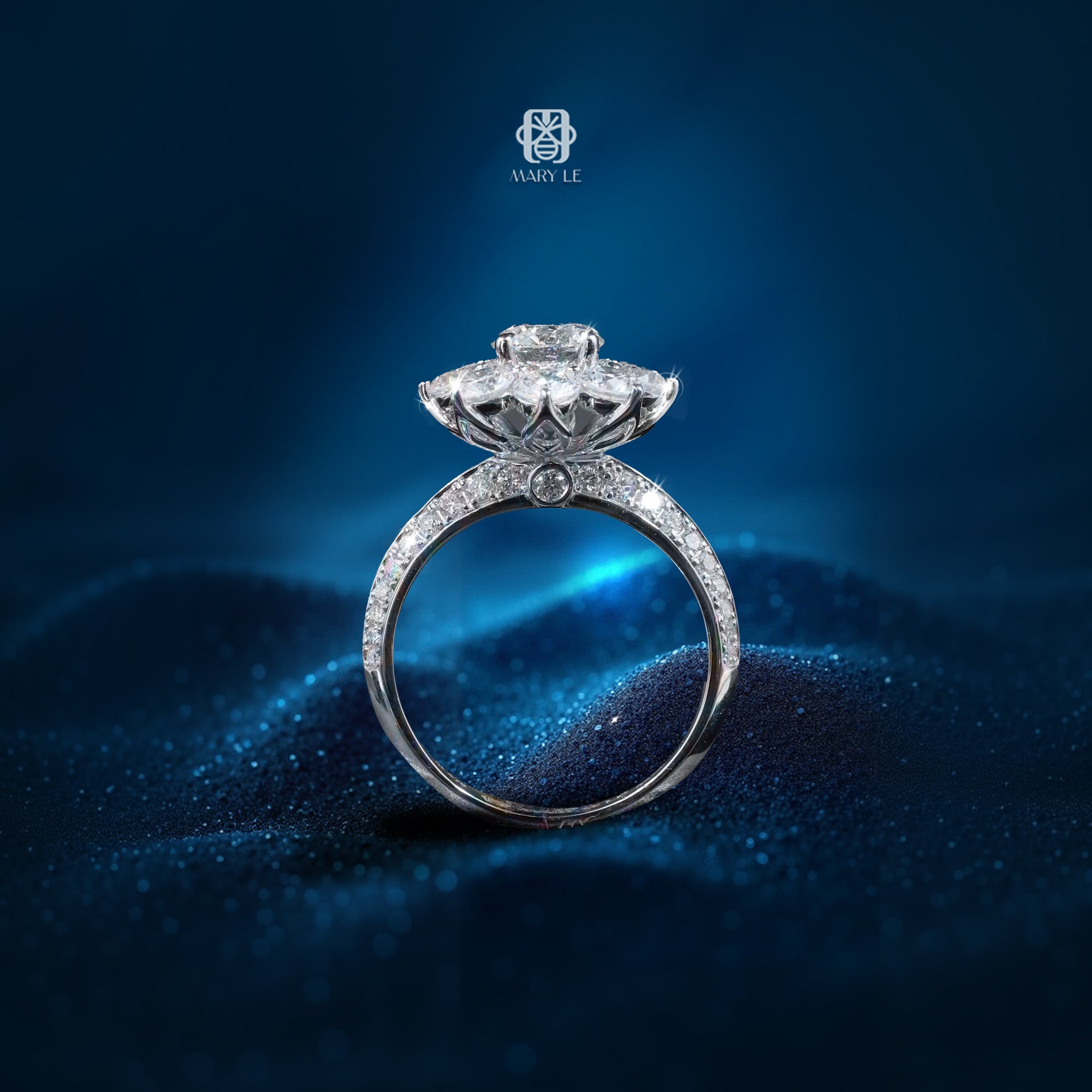 Tỏa sáng như một đóa hoa hướng dương được kết tinh từ ánh sáng, rực rỡ nhưng không phô trương, kiêu hãnh mà vẫn giữ trọn sự thanh tao. Ở trung tâm là viên kim cương tỏa sáng với cường độ mạnh mẽ và thuần khiết tựa mặt trời nhỏ được giữ lại trong hình hài vĩnh cửu. Từng giác cắt phản chiếu ánh sáng sâu và đều, tạo nên cảm giác ấm áp, sống động, mang năng lượng của sự sống, niềm tin và sức mạnh nội tại. Bao quanh bởi những cánh hoa kim cương sắp xếp cân xứng và mềm mại, tạo thành một vòng hào quang nở rộ. Mỗi viên đá như một cánh hoa được mài giũa hoàn hảo, đón ánh sáng và phản chiếu lấp lánh ở mọi góc nhìn. Tổng thể tạo nên cảm giác đang chuyển động, như một đóa hoa đang hé nở trọn vẹn trong khoảnh khắc đẹp nhất của đời mình. Lấy cảm hứng từ hoa hướng dương, biểu tượng của sự kiên định, lạc quan và lòng trung thành với ánh sáng, chiếc nhẫn không chỉ là một thiết kế trang sức, mà là một tuyên ngôn tinh tế. Đó là hình ảnh của người phụ nữ luôn hướng về điều tích cực, biết mình muốn gì, dám tỏa sáng và không ngại trở thành tâm điểm theo cách rất riêng, rất thanh lịch.