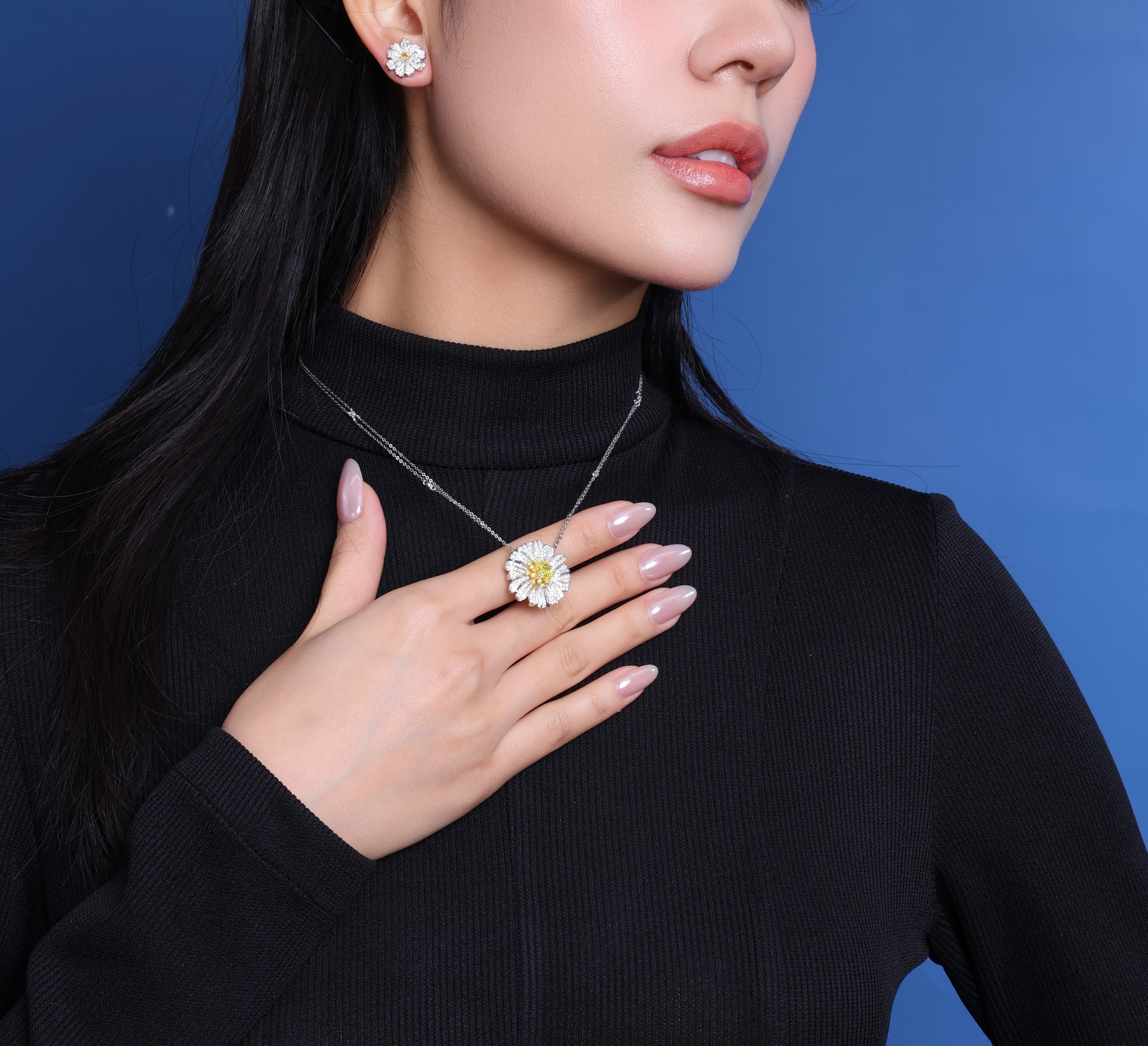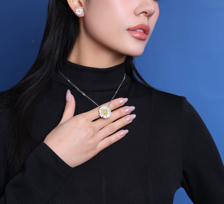 Mặt dây chuyền được tạo tác theo hình hoa nở rộ, nơi từng cánh hoa uốn cong mềm mại, đan xen hoàn hảo để tôn vinh vẻ đẹp của thiên nhiên ở trạng thái rực rỡ nhất. Những viên kim cương trắng được tuyển chọn kỹ lưỡng, đính pavé dày dặn trên từng cánh, phản chiếu ánh sáng với độ lấp lánh đầy mê hoặc. Ở trung tâm, viên chủ Fancy Vivid Yellow rực rỡ trở thành điểm nhấn đầy cuốn hút, tỏa ra sắc vàng ấm áp và hiếm có, tạo nên sự tương phản hoàn hảo với ánh trắng tinh khiết xung quanh. Sự sắp đặt tinh tế này mang lại chiều sâu, sức sống và cảm giác chuyển động tự nhiên cho thiết kế.