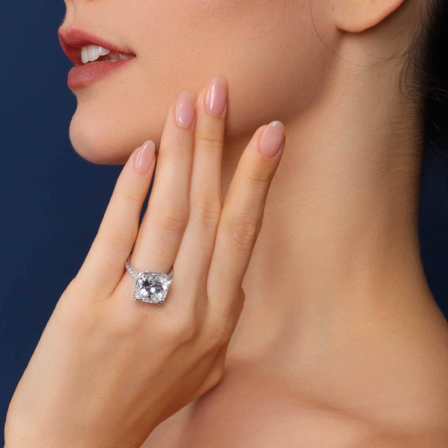 This elegant diamond ring from the “Timeless Cushion” collection features a 10.01 carat colorless Cushion diamond – a masterpiece of classic, pure and timeless beauty. The diamond is cut in a cushion shape – famous for its soft lines, perfectly combining the square shape with the graceful, sensual curves of rounded corners. This combination creates a subtle sparkle and visual depth, making the stone always shine gently but enchantingly.