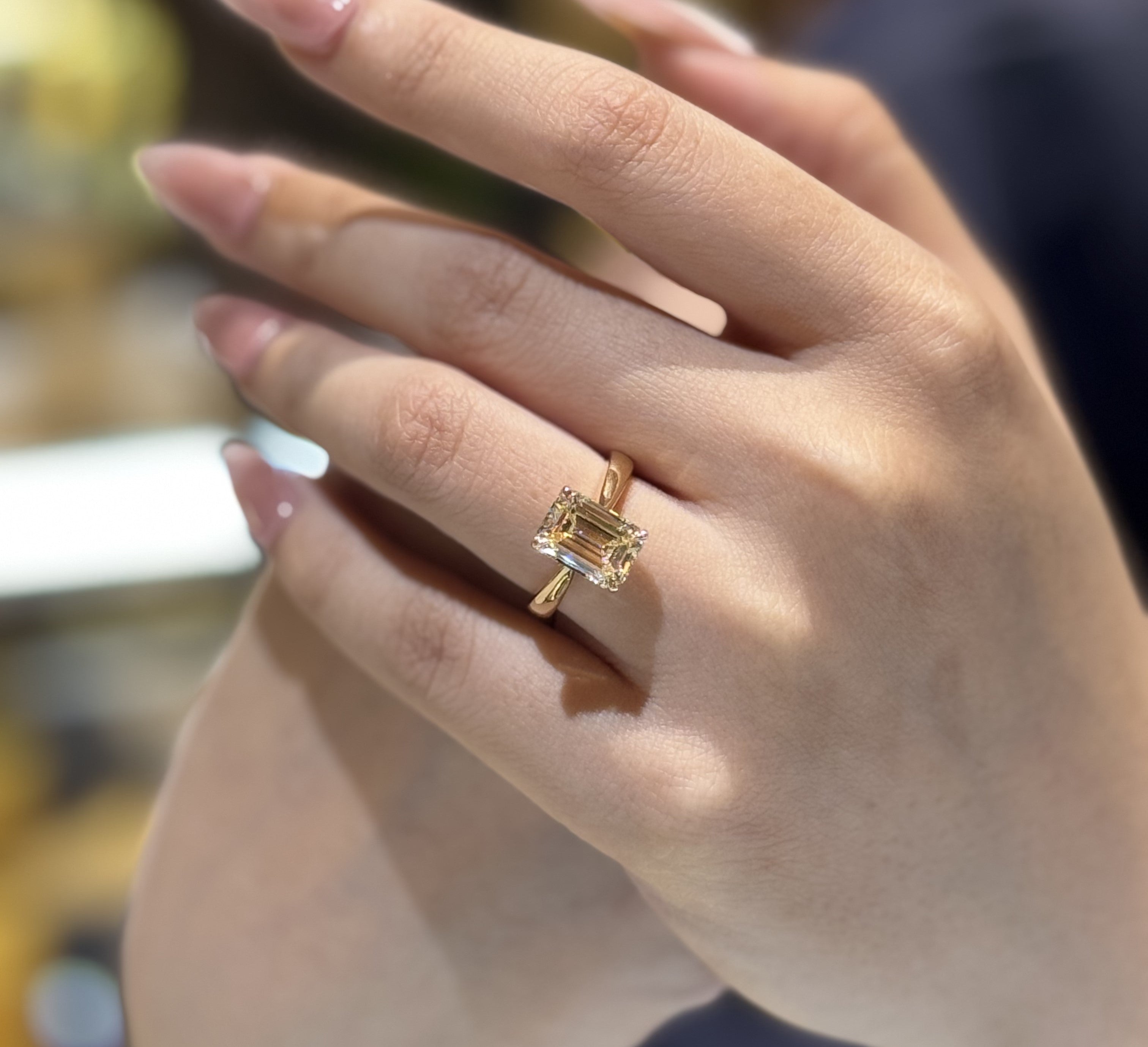 Viên kim cương Emerald 3.52 carat rực rỡ, như một cấu trúc ánh sáng mang trật tự riêng. Những đường cắt hút sâu, thẳng, trong trẻo đến tuyệt đối tạo nên cảm giác của một không gian được sắp đặt hoàn hảo, rõ ràng, tự tin và không nhượng bộ.