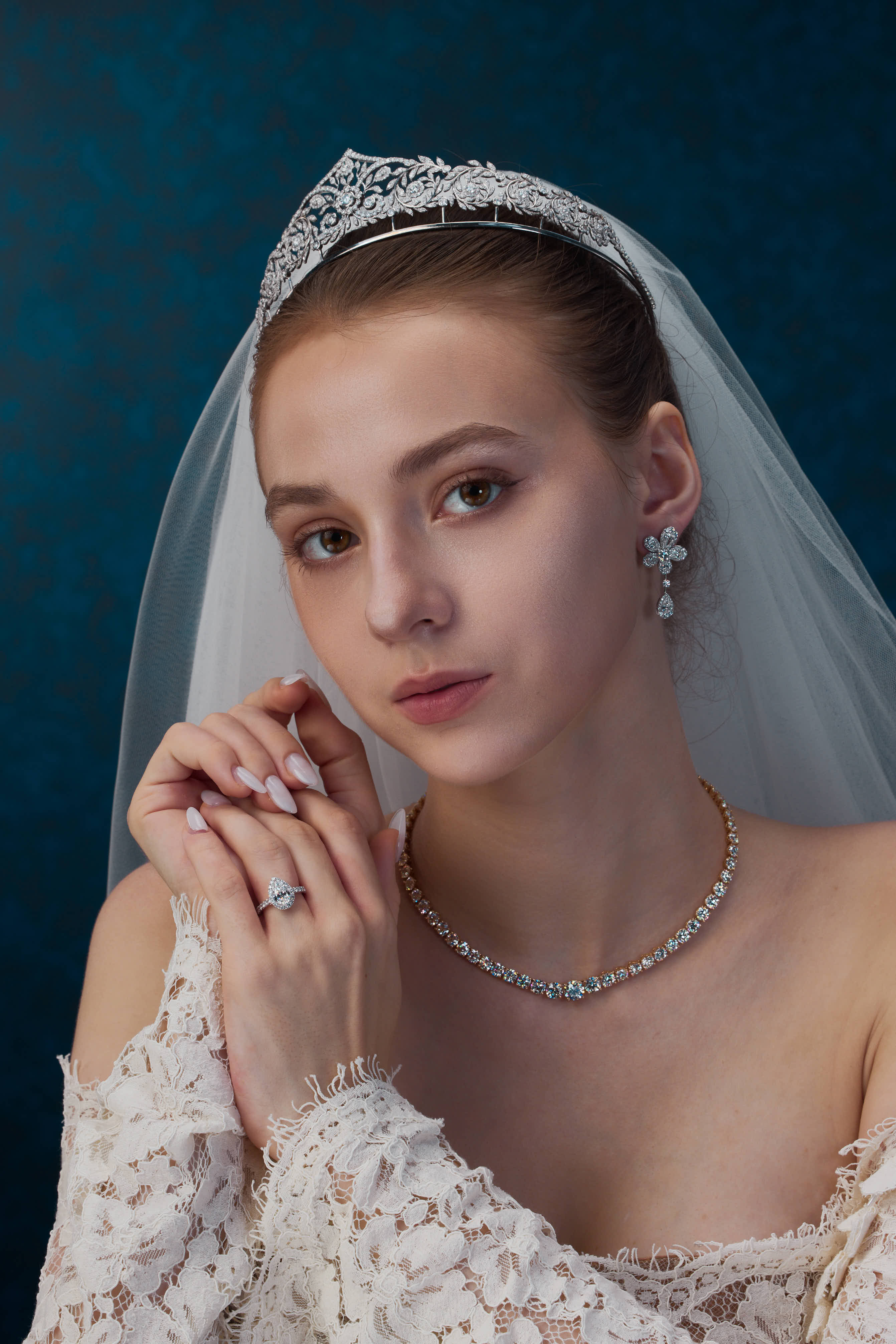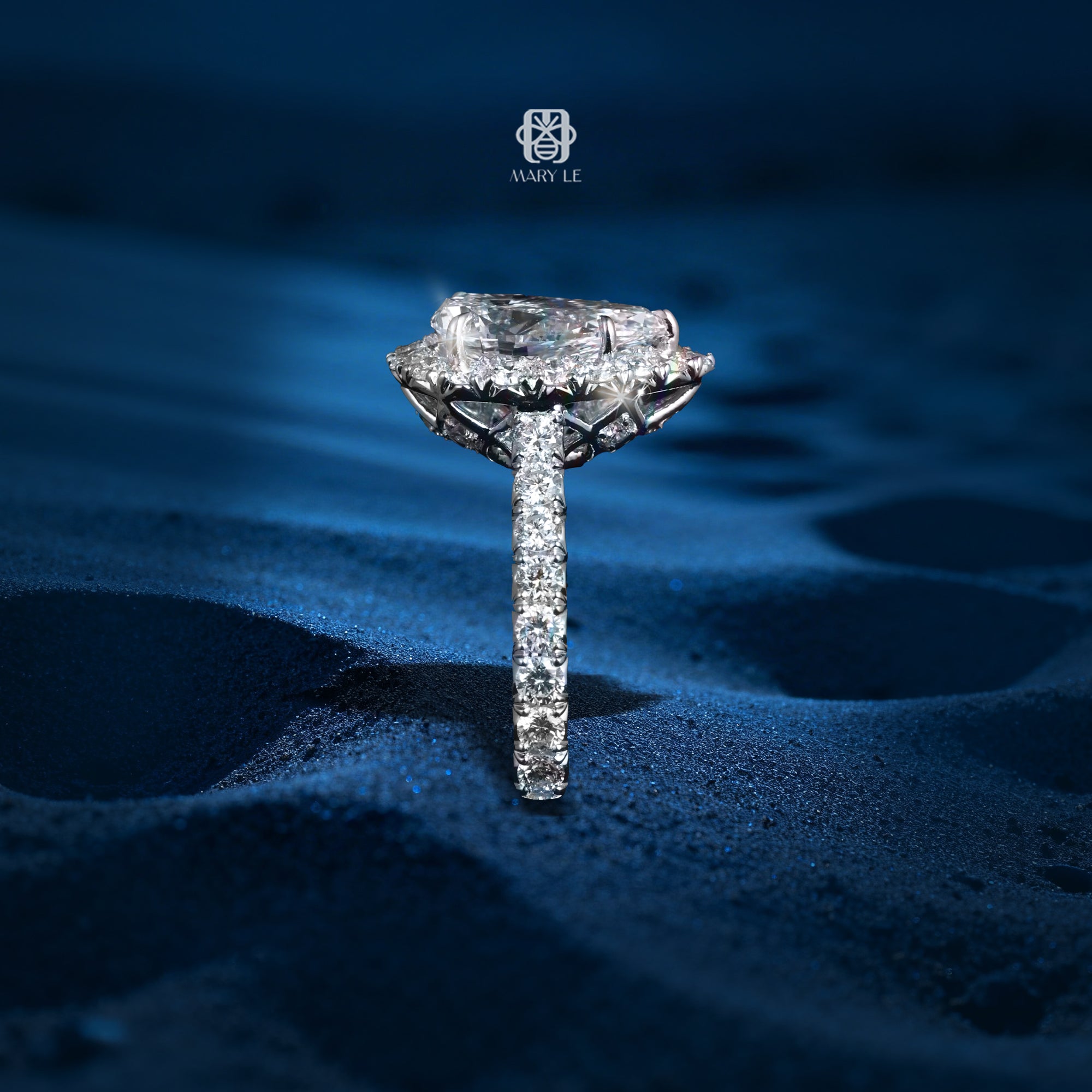 Ở vị trí trung tâm, viên kim cương chủ 1,51 carat mang sắc D – cấp độ màu cao nhất theo tiêu chuẩn quốc tế, đạt độ trắng tuyệt đối, cùng độ tinh khiết IF (Internally Flawless) – gần như không có tạp chất bên trong. Đây là sự hội tụ của những tiêu chuẩn hiếm có nhất trong thế giới kim cương, nơi ánh sáng được phản chiếu một cách hoàn hảo, tạo nên hiệu ứng lấp lánh thuần khiết và rực rỡ. Bao quanh viên chủ là 40 viên kim cương thiên nhiên, nâng tổng trọng lượng lên 3,2 carat, được tuyển chọn và sắp đặt tỉ mỉ để tôn vinh tuyệt đối vẻ đẹp của viên trung tâm. Mỗi viên kim nhỏ như một điểm sáng, góp phần tạo nên bản giao hưởng ánh sáng đa tầng, lan tỏa từ mọi góc nhìn. Toàn bộ tác phẩm được chế tác trên nền bạch kim (Platinum) – kim loại quý hiếm với độ bền vĩnh cửu và sắc trắng tự nhiên, giúp giữ trọn vẹn ánh sáng nguyên bản của kim cương theo thời gian.
