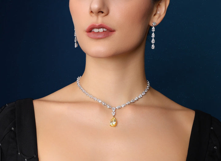 Tựa như dải ngân hà được kết từ ánh sáng, chiếc vòng cổ “Drop of Grace” là tuyên ngôn rực rỡ của vẻ đẹp vượt thời gian và quyền lực thanh lịch. Trung tâm của tuyệt phẩm là viên kim cương chủ hình giọt nước nặng 11.04 carat, sắc màu Fancy Intense Yellow – một trong những cấp màu hiếm và được săn lùng nhất. Với độ sạch VVS1 gần như hoàn hảo, viên đá toả ra ánh sáng ấm rực, sâu lắng và kiêu hãnh như vầng thái dương lúc bình minh. Một biểu tượng mạnh mẽ của sự thịnh vượng, danh vọng và năng lượng sống mãnh liệt.