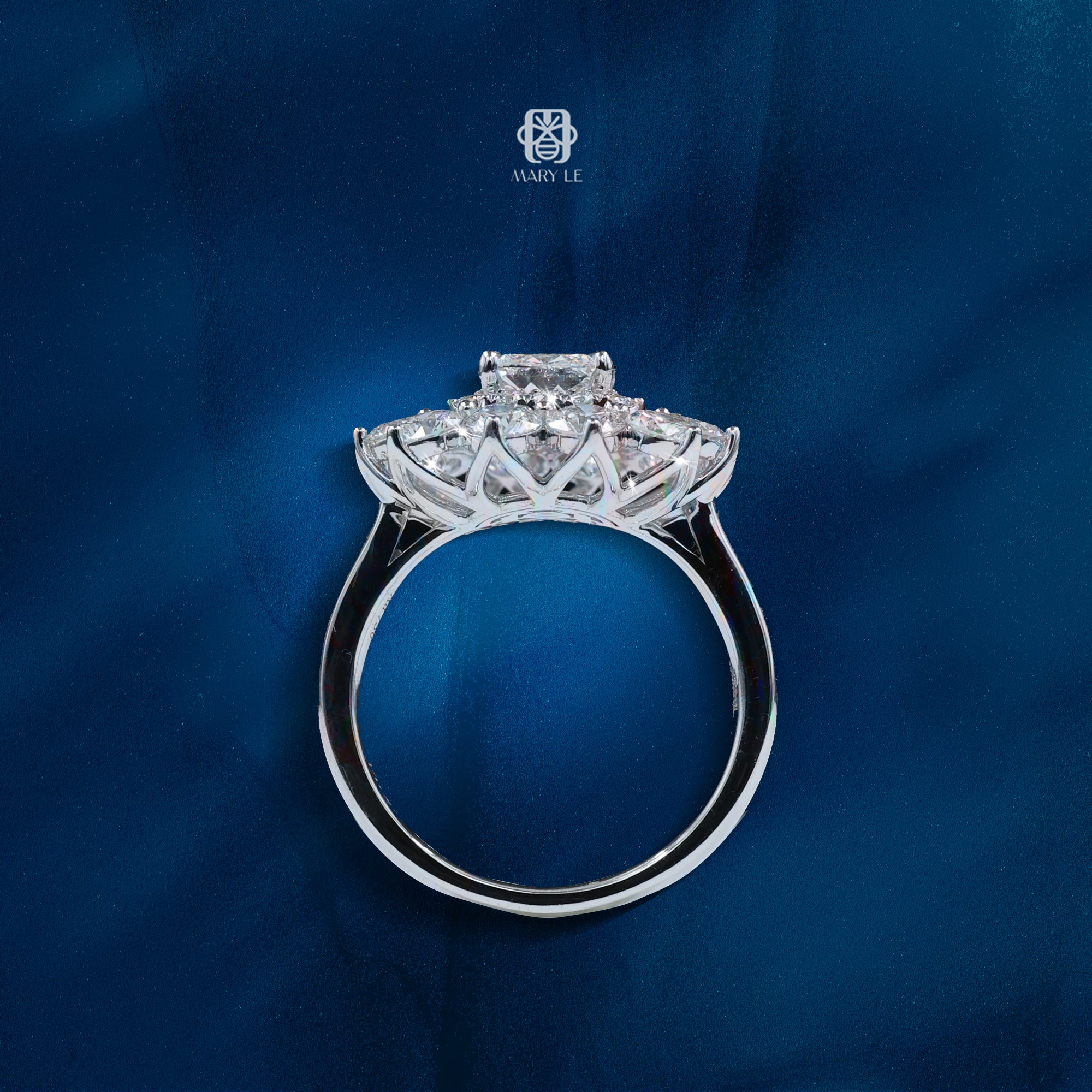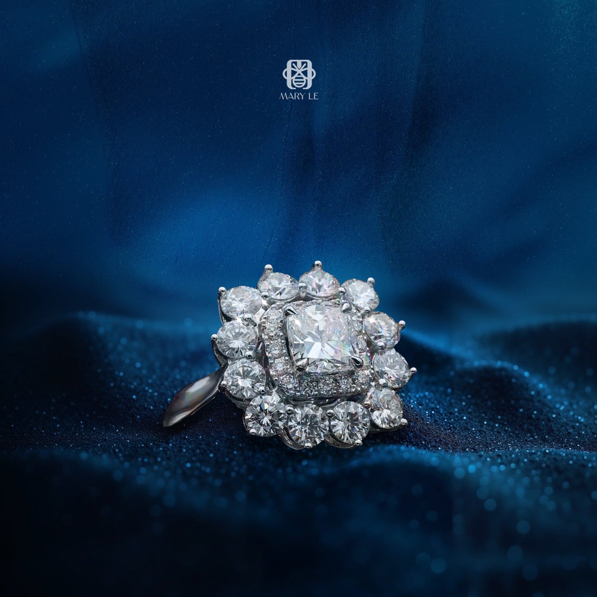 Solar Blossom – Vầng dương nở rộ trên đầu ngón tay. Chiếc nhẫn kim cương Solar Blossom tâm điểm là viên kim cương Cushion không màu 1.03 carat, lấp lánh như mặt trời thuần khiết, được nâng niu bởi 12 viên kim cương hình tròn sắp xếp khéo léo tạo thành những cánh hoa tỏa rạng rỡ.