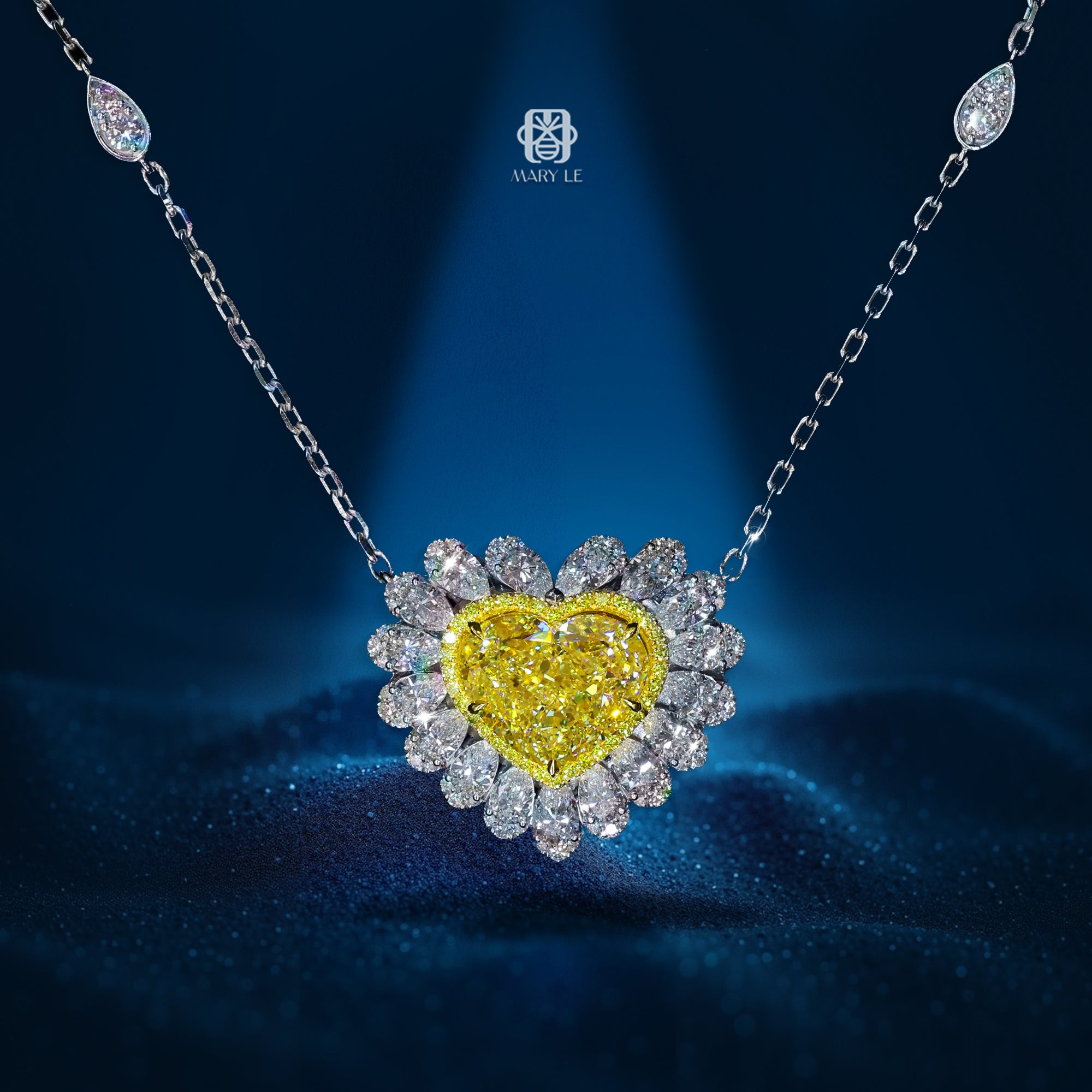 Như đóa hướng dương rạng rỡ vươn mình đón nắng, Heart & Soul Diamond Necklace - nơi trái tim vàng rực tỏa sáng giữa những cánh hoa kim cương trong trẻo. Tâm điểm của tuyệt phẩm là viên kim cương vàng hình trái tim 12.15 carat sắc độ Fancy Brown Yellow ấm áp, sâu lắng như ánh mặt trời mỗi sớm bình minh. 159 viên kim cương tự nhiên, tổng trọng lượng 14.35 carat cùng hòa ca trong bản nhạc du dương, tựa những cánh hoa lấp lánh đang hướng về nguồn sáng bất tận. Mỗi giác cắt là một nhịp thở của tình yêu, tinh khôi, thuần khiết nhưng mãnh liệt. Ánh vàng nơi tâm điểm như lời nhắn nhủ: hạnh phúc thật sự bắt đầu khi ta biết hướng về ánh sáng, khi trái tim dám tỏa sáng cho chính mình và cho người mình yêu thương.