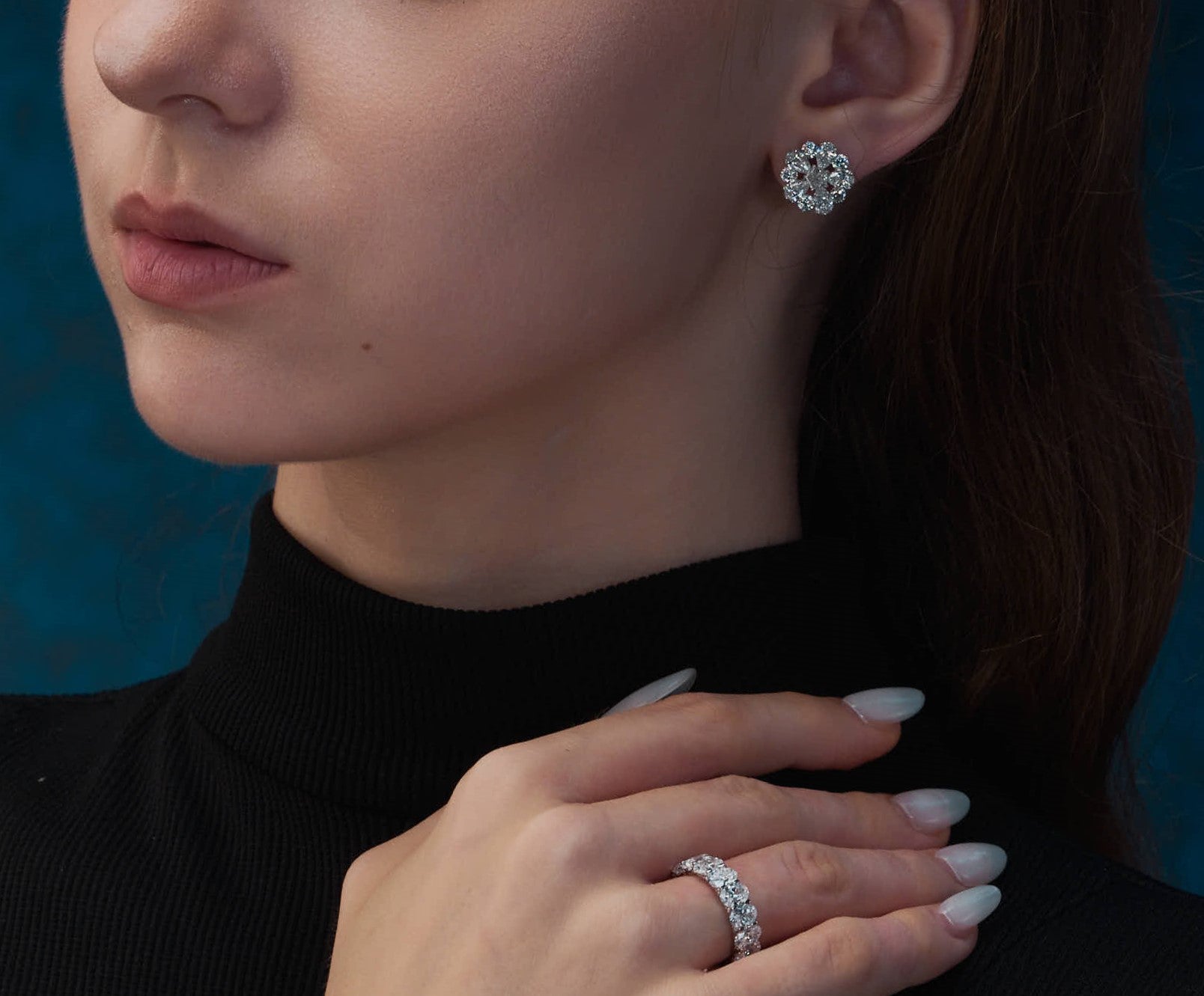 Đầy sống động với những viên kim cương dáng giọt nước độ sạch D - E - F,trong trẻo tựa như giọt tinh túy nhất của đất trời đang tan chảy giữa tâm nhụy, được ôm ấp bởi cấu trúc ngũ giác kim cương sắc nét tượng trưng cho sự cân bằng vĩnh cửu.