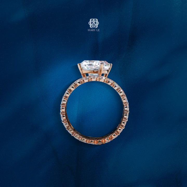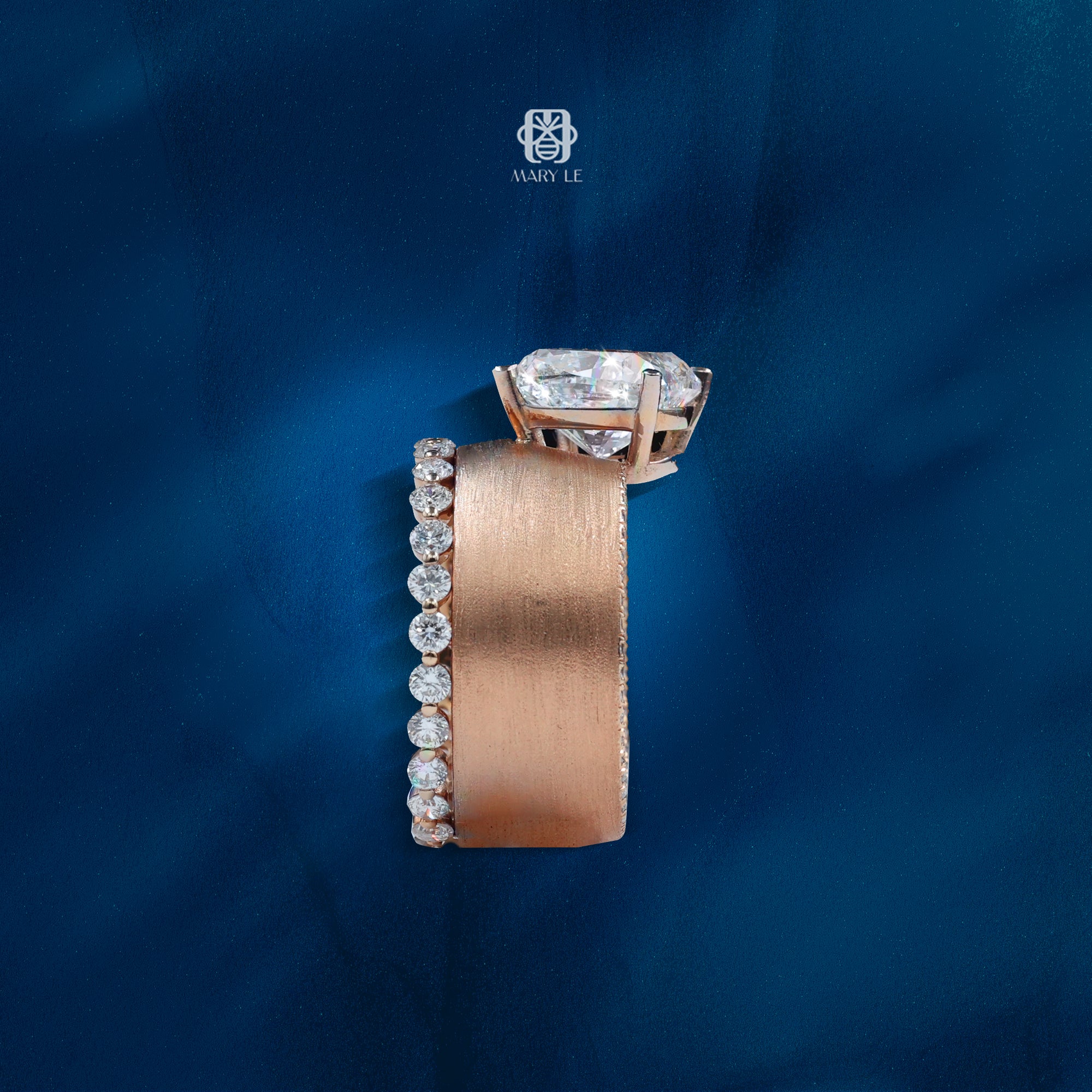 Một dấu ấn táo bạo của sự tự do và phong cách. Chiếc nhẫn nổi bật với thiết kế freestyle đầy cá tính, trong đó viên kim cương chủ giác cắt cushion được đặt nghiêng độc đáo, tạo cảm giác chuyển động tự nhiên và phá vỡ mọi quy chuẩn truyền thống. Viên chủ tỏa sáng rực rỡ với độ tinh khiết cao, được giữ bởi 4 chấu vàng hồng thanh mảnh, nổi bật hoàn toàn trên nền nhẫn bản lớn. Thân nhẫn được chế tác từ vàng hồng 18K với bề mặt chải mờ, tạo hiệu ứng chất liệu sang trọng nhưng vẫn giữ sự ấm áp và tinh tế. Dọc theo chân nhẫn là một hàng kim cương tấm đính liên tục, như một dải ánh sáng lấp lánh, tăng độ phản chiếu cho toàn bộ thiết kế và tôn lên sự mềm mại trong vẻ mạnh mẽ. Chiếc nhẫn là tuyên ngôn dành cho người phụ nữ tự do – người dám khác biệt, dám nổi bật và không bị giới hạn bởi bất kỳ khuôn mẫu nào. Một thiết kế kết hợp hoàn hảo giữa nghệ thuật thủ công tinh xảo và tư duy hiện đại, phù hợp để đeo hằng ngày hoặc làm nhẫn đính ước cho những tâm hồn phá cách.