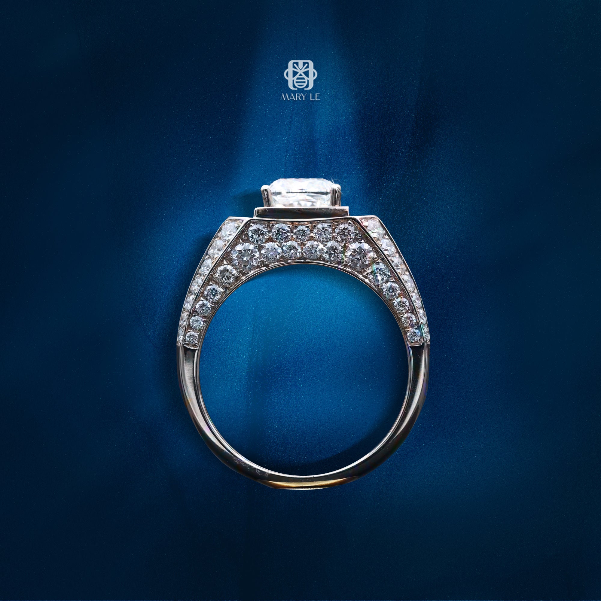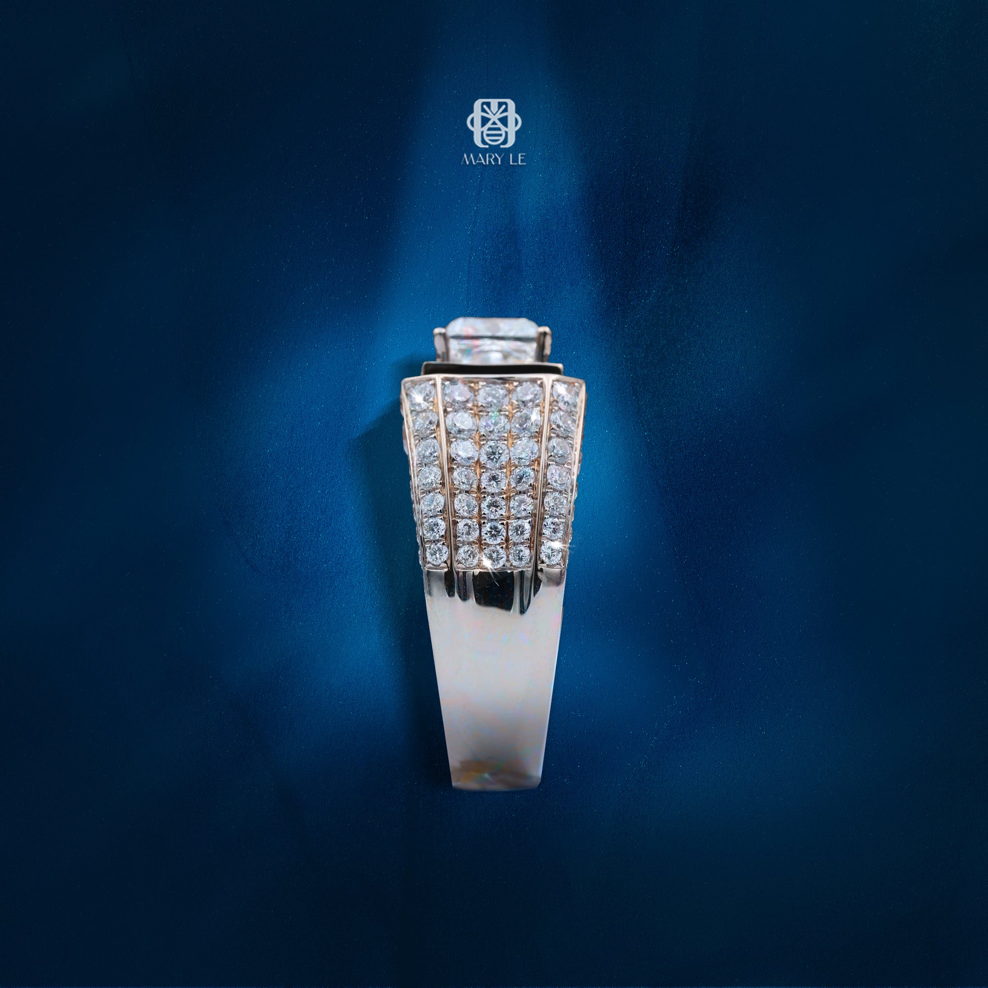 Chiếc nhẫn kim cương nam nổi bật với viên kim cương chủ giác cắt cushion 2 carat không màu. Viên chủ được đặt trong khung vàng hồng 18K cứng cáp, với đường nét dứt khoát, tạo nên một tổng thể đầy nam tính và bản lĩnh. Phần thân nhẫn được đính dày đặc những viên kim cương tấm, trải đều hai bên, không chỉ tôn vinh vẻ rực rỡ của viên chủ mà còn khẳng định gu thẩm mỹ tinh tế và địa vị của người sở hữu.