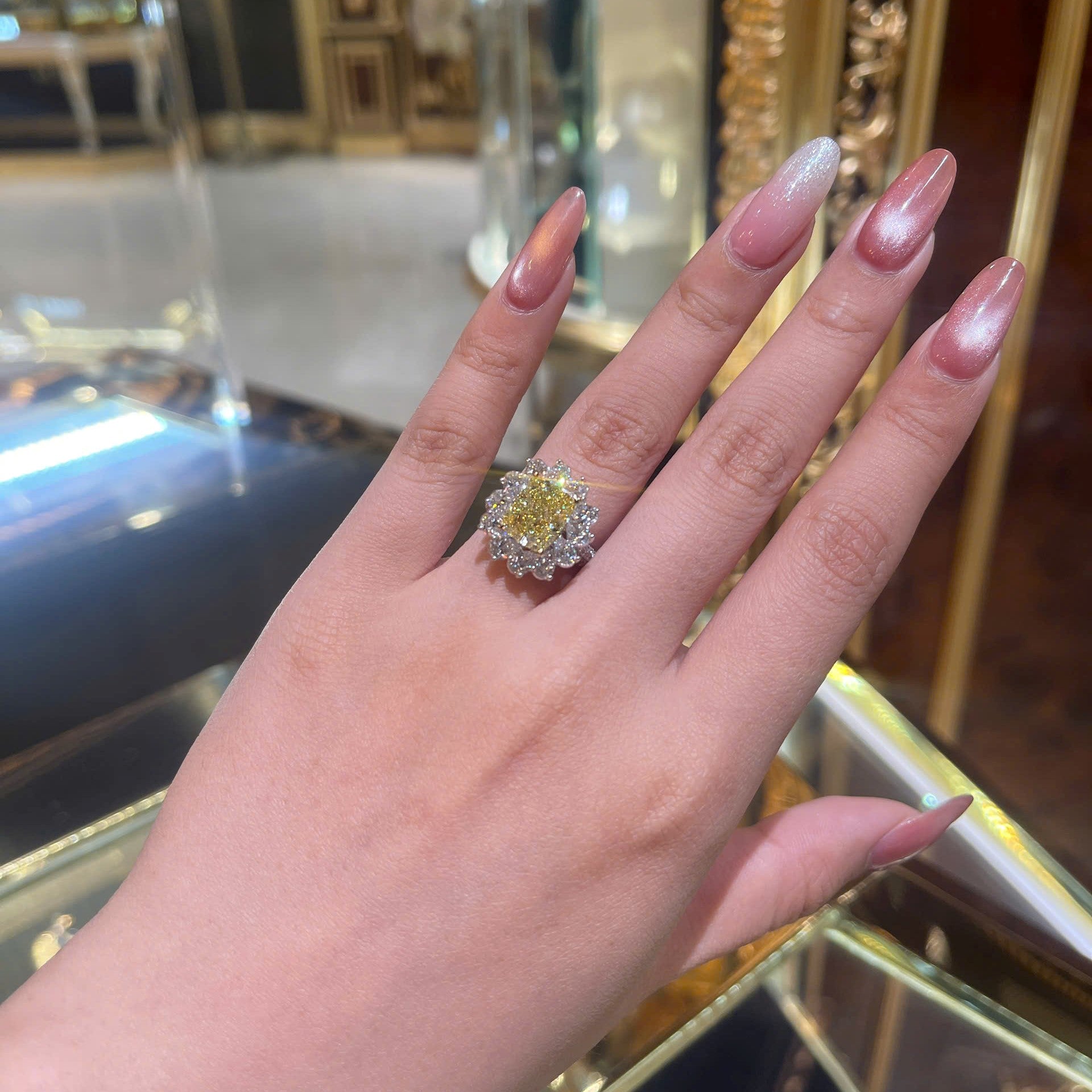 Chiếc nhẫn là một kiệt tác của ánh sáng, được thiết kế để tôn vinh vẻ đẹp rạng rỡ của người phụ nữ bản lĩnh và đầy khí chất. Tâm điểm của thiết kế là viên kim cương Cushion Cut 4.02 carat Fancy Intense Yellow – sắc vàng mãnh liệt và rực rỡ như ánh mặt trời đang ở đỉnh cao của ngày. Viên kim cương quý hiếm này không chỉ là điểm nhấn thị giác mạnh mẽ, mà còn là biểu tượng của sự thịnh vượng, năng lượng tích cực. Bao quanh viên chủ là 12 viên kim cương Pear Cut không màu, được xếp xen kẽ như những cánh hoa hướng về ánh sáng. Sự chuyển động mềm mại từ sắc trắng tinh khôi đến sắc vàng rực rỡ tạo nên hiệu ứng thị giác tuyệt mỹ – giống như một đóa hoa mặt trời đang nở rộ trong vầng hào quang chói lọi. Thiết kế độc bản này được chế tác từ sự kết hợp giữa vàng trắng 18K và vàng vàng 18K, vừa tôn lên sắc độ tự nhiên của viên chủ, vừa mang đến chiều sâu và độ sang trọng cho toàn bộ cấu trúc nhẫn.