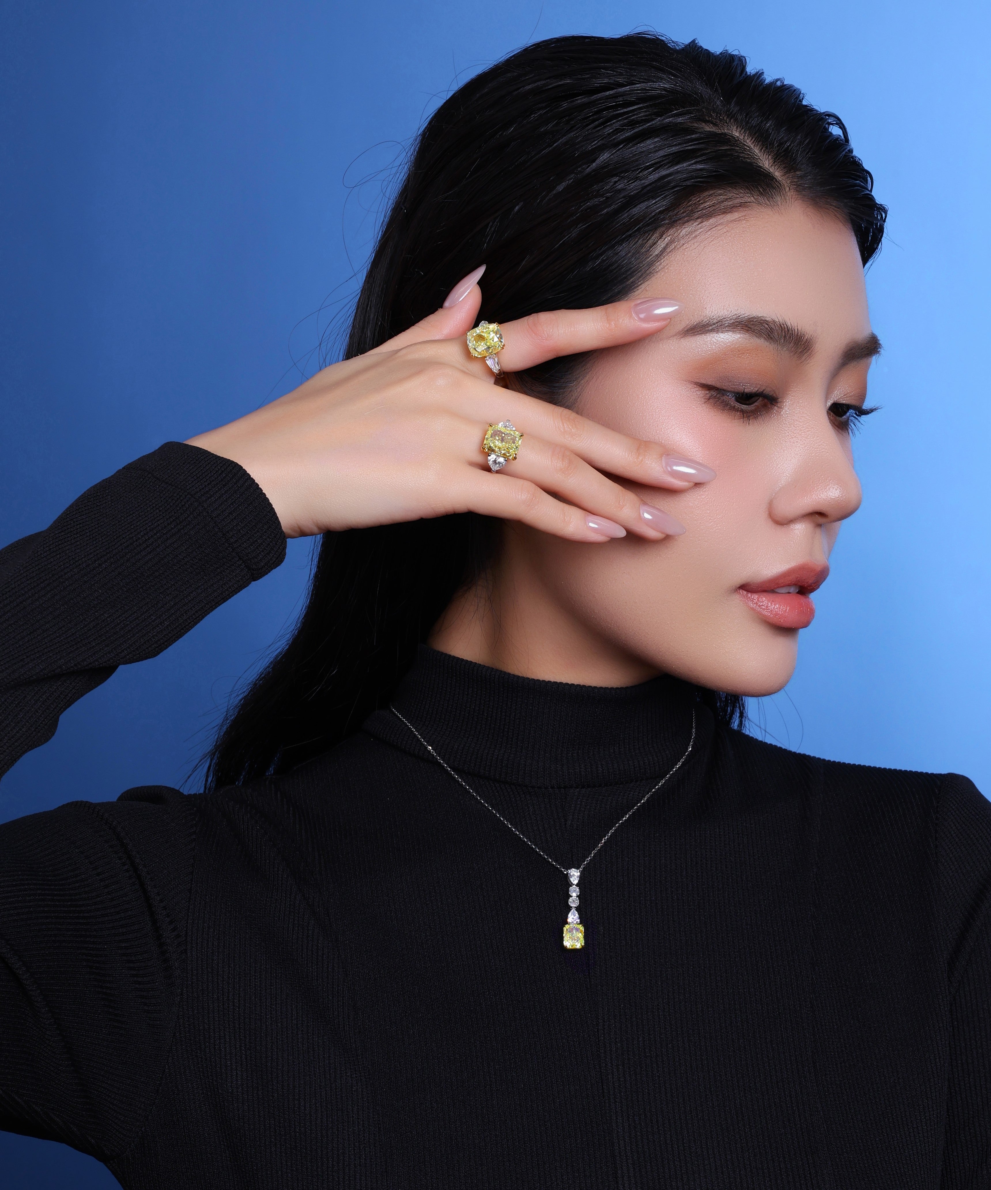 Đến từ bộ sưu tập Stellar Glow, chiếc nhẫn kim cương này là một tuyệt tác rực rỡ với viên kim cương chủ hình Cushion, nặng 10.03 carat, sắc độ Fancy Intense Yellow (FIY) – một trong những màu vàng sống động và quý hiếm nhất trong thế giới kim cương tự nhiên. Viên chủ như mang trong mình ánh hào quang của một ngôi sao vàng giữa vũ trụ, vừa ấm áp, vừa rực rỡ. Tôn vinh viên đá chủ là hai viên kim cương hình Bullet không màu, được chế tác riêng cho thiết kế này – hai chùm ánh sáng nằm đối xứng, như đôi cánh nâng đỡ cho vì sao trung tâm toả sáng. Sự kết hợp tương phản giữa sắc vàng mãnh liệt và sắc trắng tinh khiết tạo nên một bố cục hoàn hảo về thị giác.