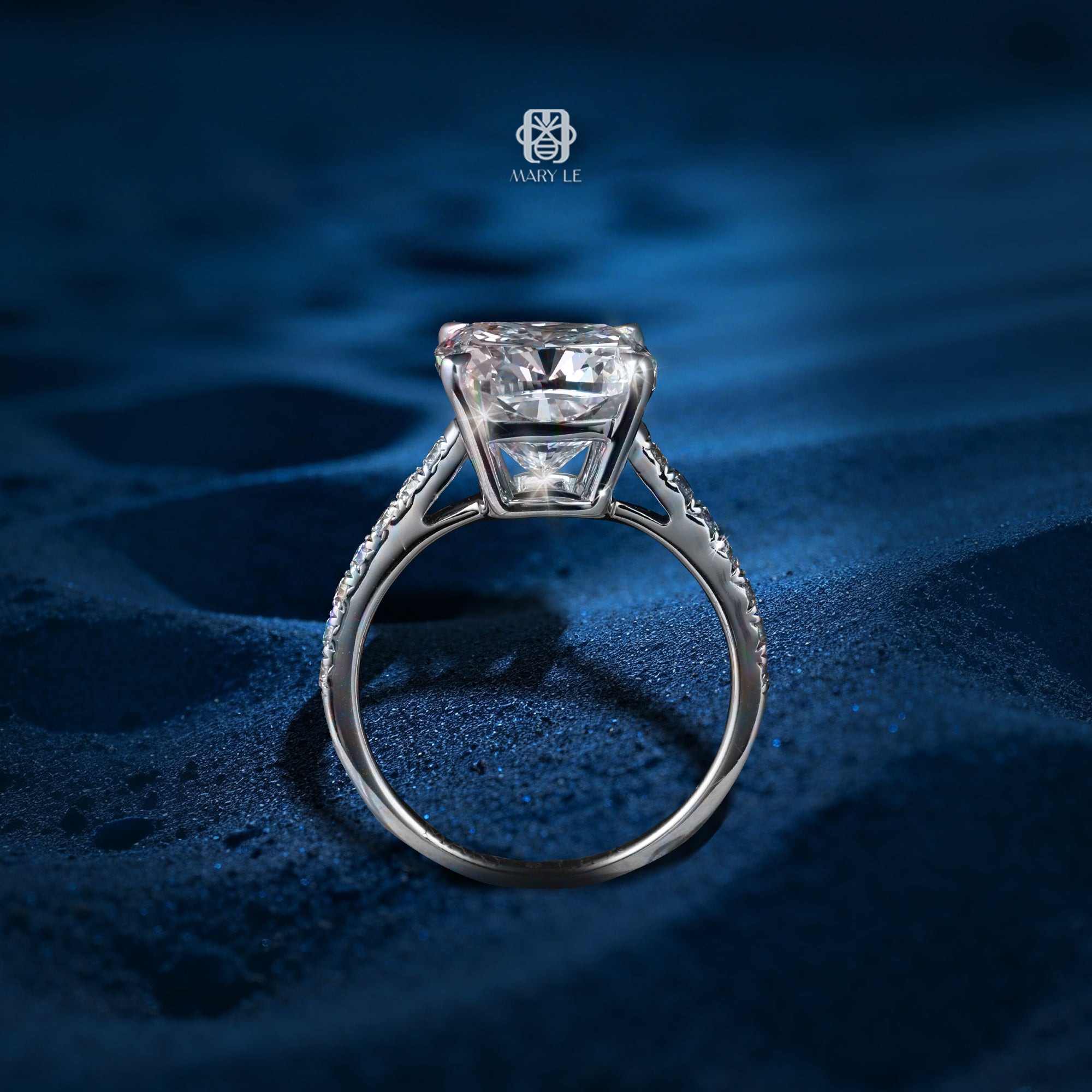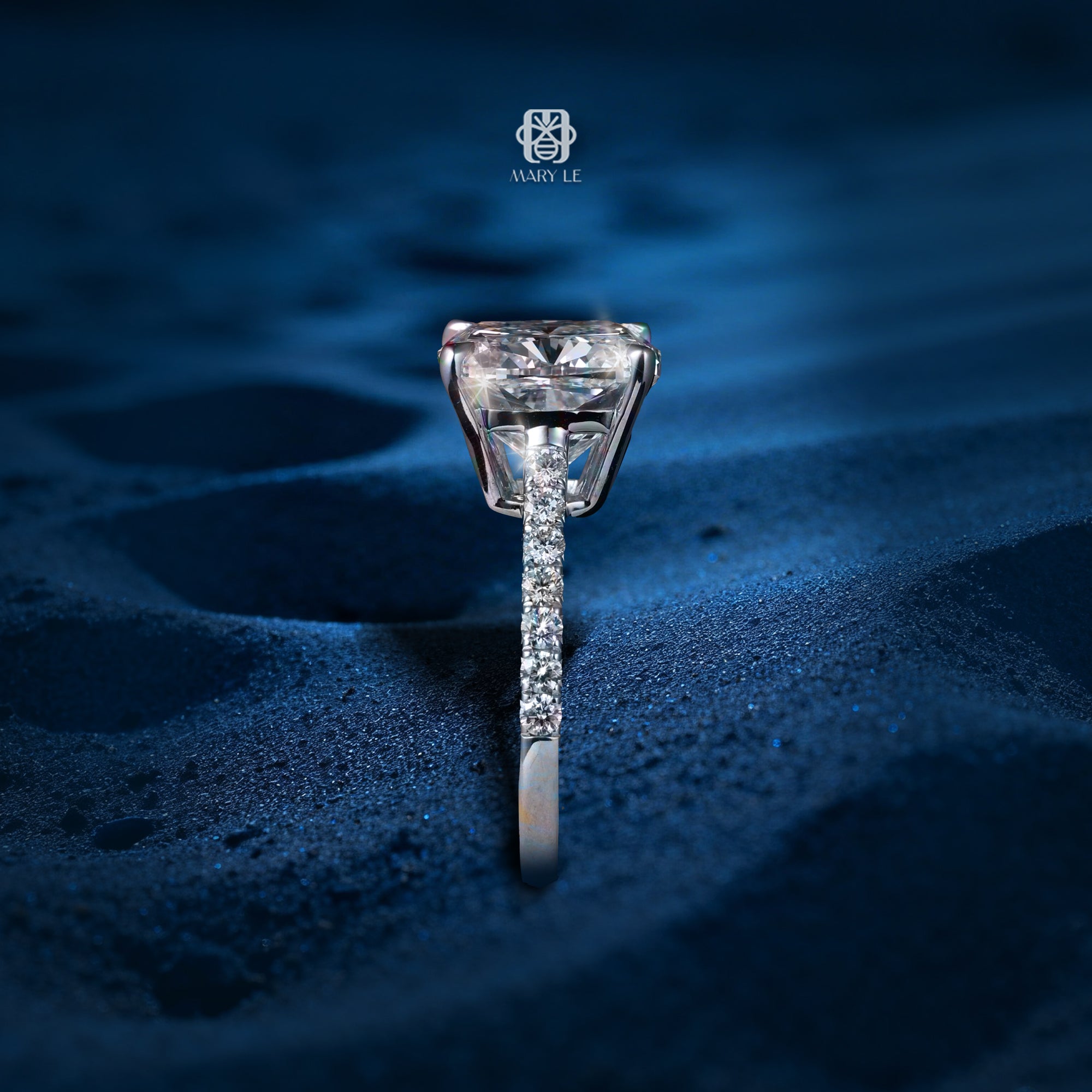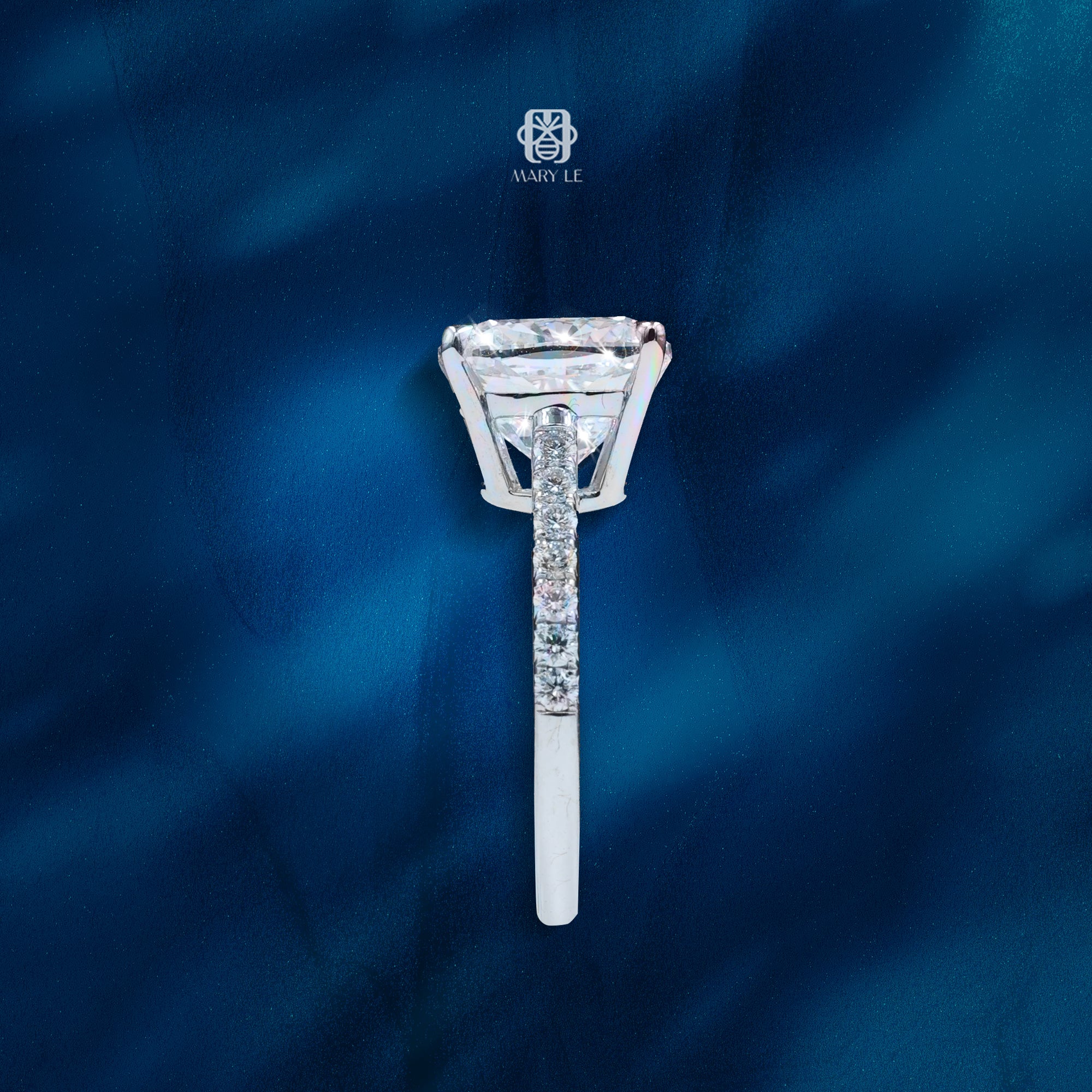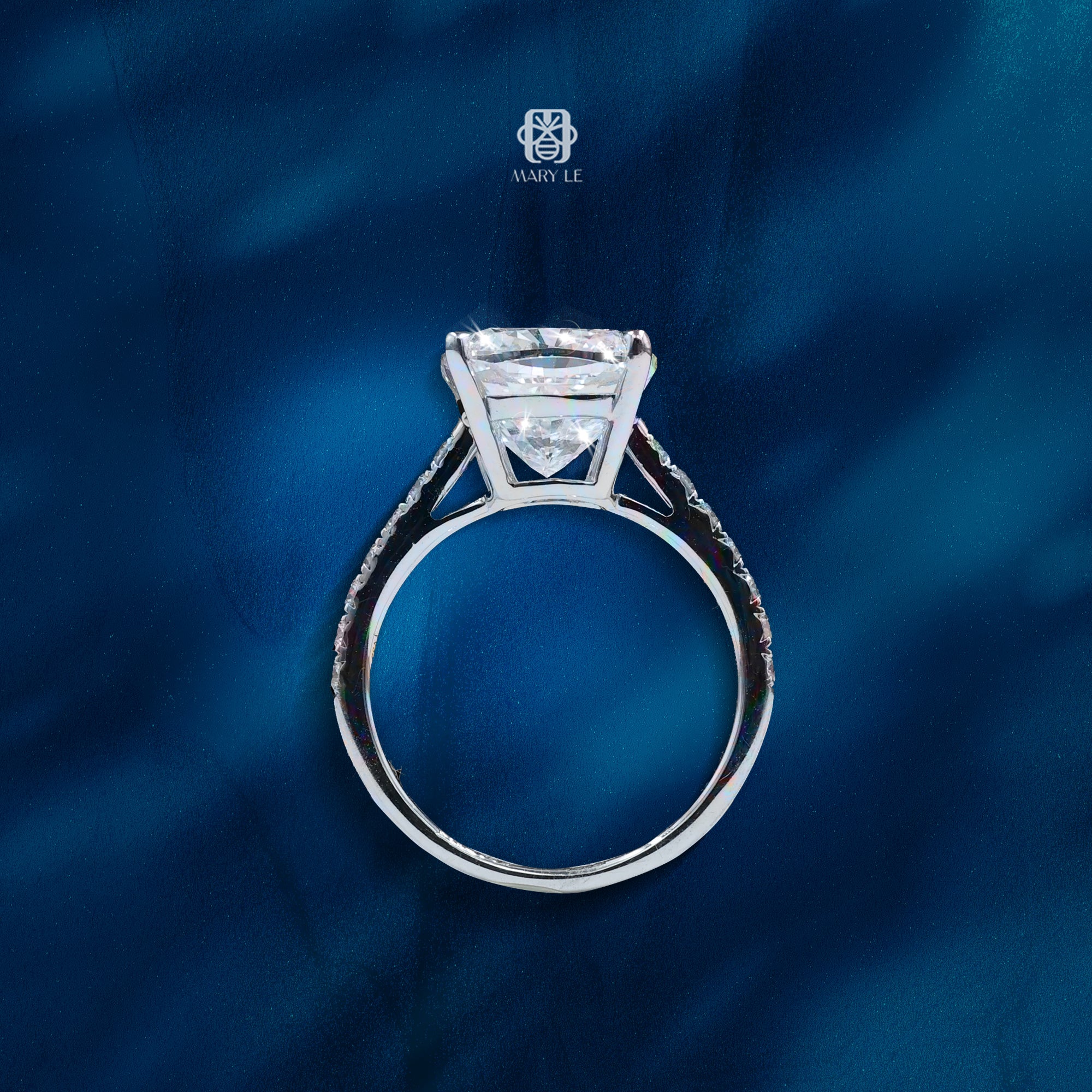 Dọc theo thân nhẫn là hàng kim cương tấm nhỏ tinh tế, đóng vai trò như ánh sáng dẫn lối, làm nổi bật thêm độ lấp lánh của viên trung tâm mà không làm lu mờ sự thanh nhã tổng thể.