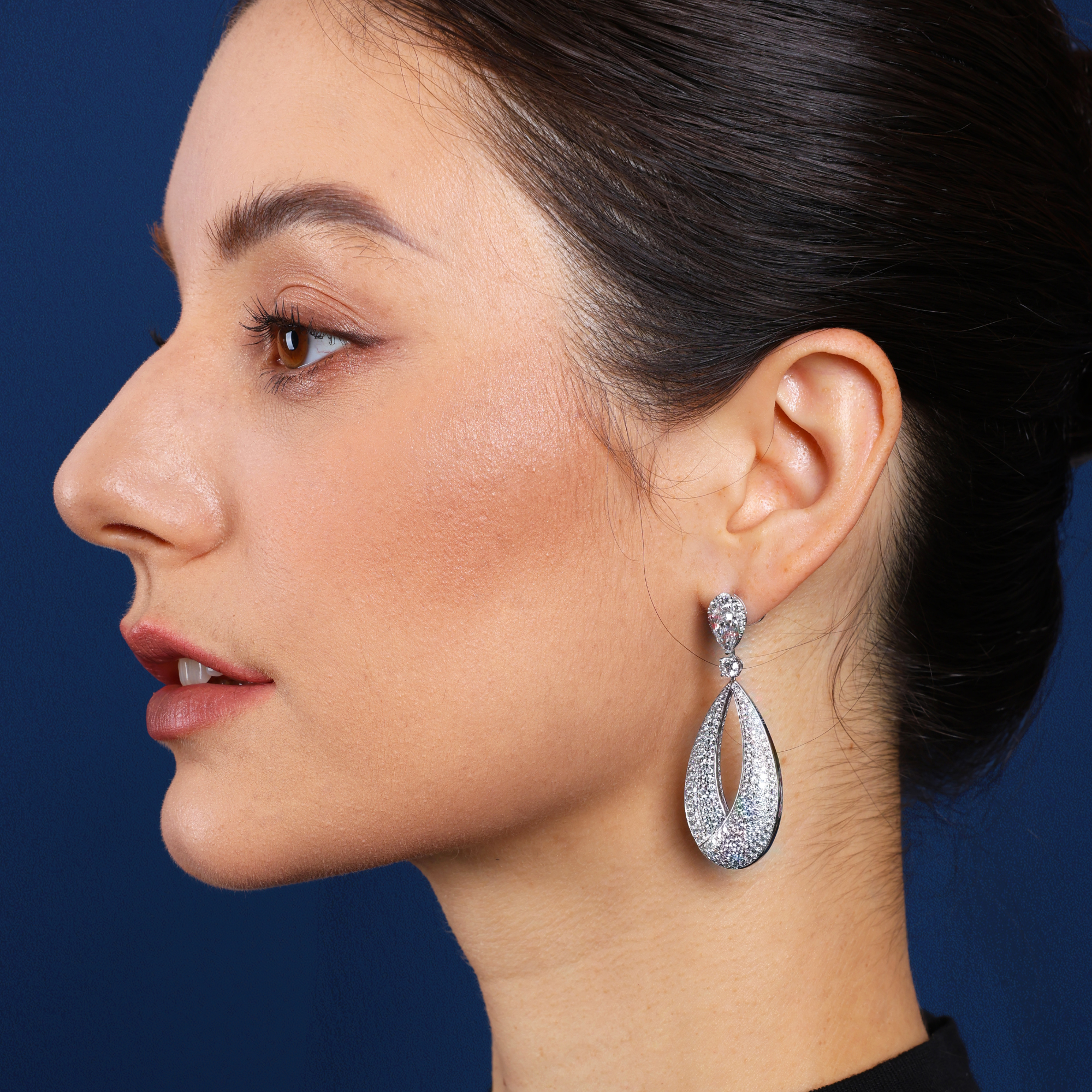Tựa như dải lụa mềm mại đang xoắn mình trong làn gió, đôi hoa tai tôn vinh vẻ đẹp uyển chuyển của những đường cong hoàn hảo. Nổi bật ở vị trí trung tâm là hai viên kim cương giọt nước D-color rực rỡ, biểu tượng của sự thuần khiết và đẳng cấp tối thượng. Bao quanh là tổng cộng 362 viên kim cương tỏa sáng lấp lánh, được chế tác kỳ công tỉ mỉ từng đường nét chi tiết. Sự hòa quyện giữa độ sáng chói và đường nét thanh thoát tạo nên một tuyệt tác trang sức mang hơi thở vừa hiện đại vừa vĩnh cửu, lý tưởng cho những khoảnh khắc tỏa sáng lộng lẫy nhất.